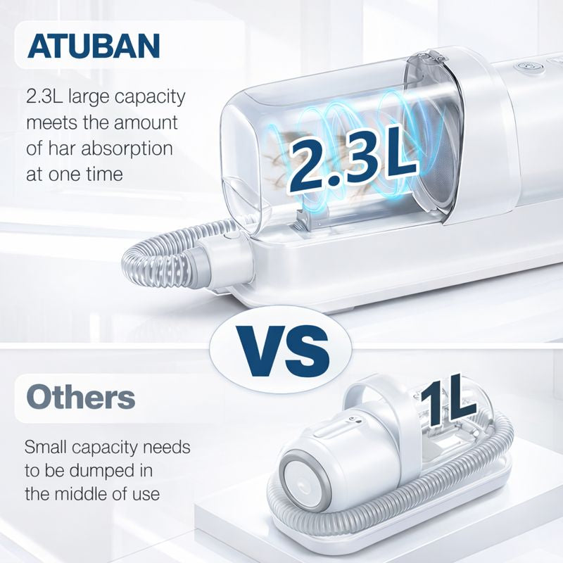 This grooming vacuum's large capacity dust cup easily captures pet hair while integrated grooming tools ensure a comfortable experience for your dog. Reduce daily mess and enjoy a tidy home.