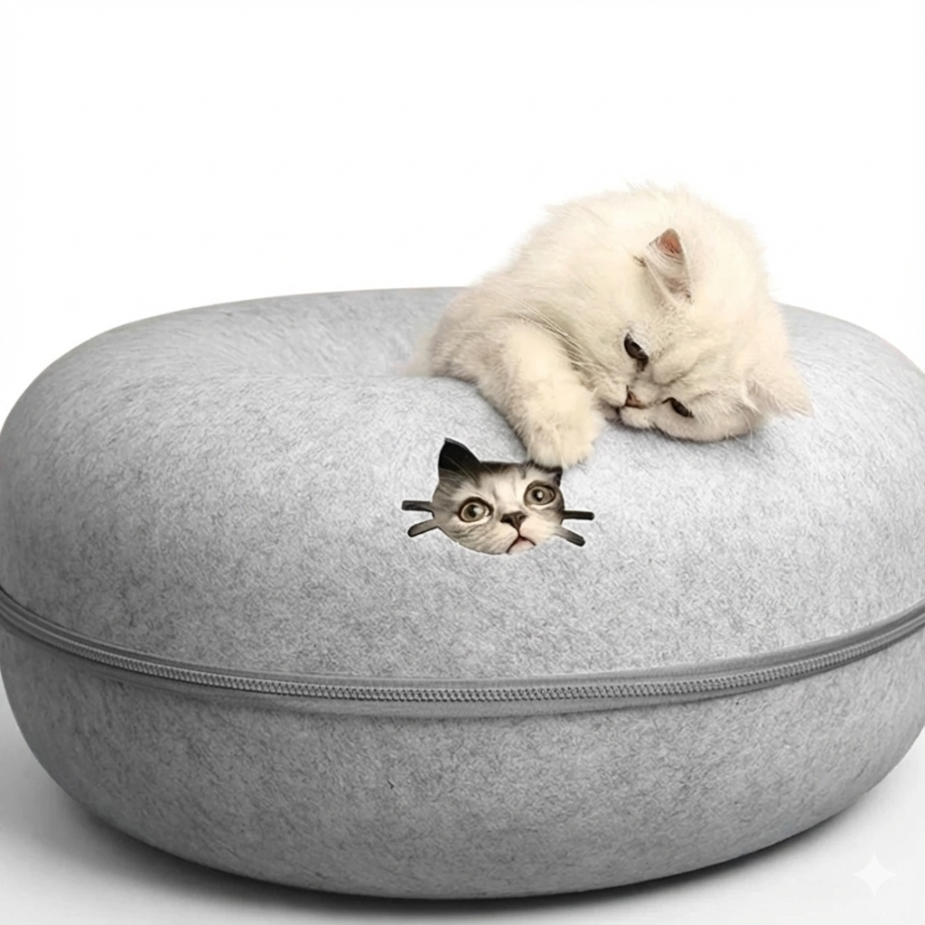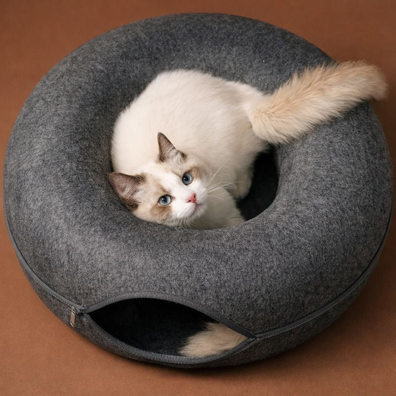 This unique 2-in-1 felt donut bed works as both a cozy nap spot and a stimulating tunnel. Sturdy yet soft, it invites cats and small dogs to sleep, play, and relax in their own private space.
